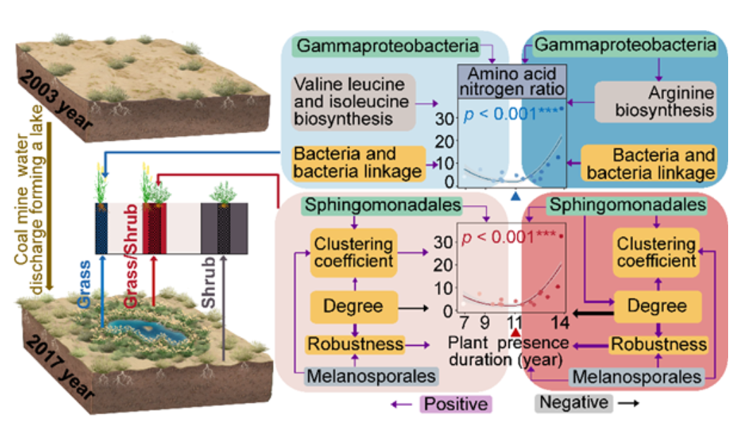 团队以位于我国宁夏回族自治区的一个由矿井水排放形成的人工湖泊(圆疙瘩湖)滨岸带为研究对象,采用“空间替代时间”的研究方法,基于卫星影像数据将矿井水排放所致的湖泊扩张及滨岸植物群落的空间异质性转换为时间序列梯度,系统探究了微生物对土壤氨基酸氮时空变化的调节机制。